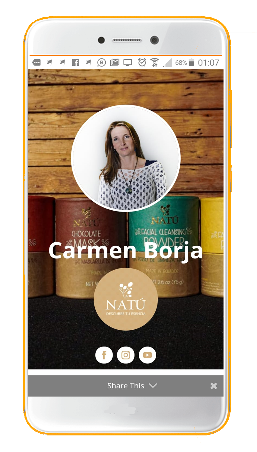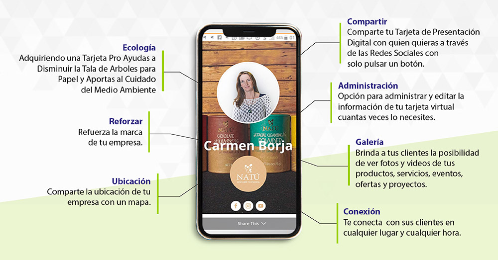 - Conecta con tus clientes, comparte fácilmente tu información por mail, messenger o whatsapp.